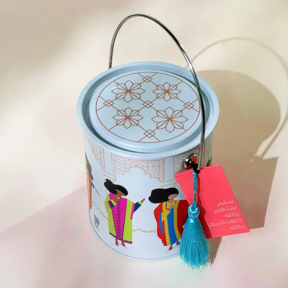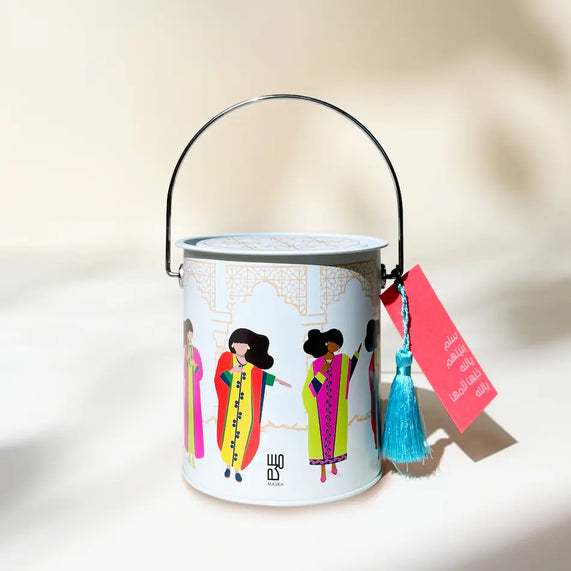 هدية مرحة وفريدة للاحتفال بحق الليلة وقرقيعان مستوحاة من ذكريات الجلوس أمام التلفاز ومشاهدة الفتيات يرقصن بأزيائهن الملونة. علبة معدنية عصرية ومرحة تصوّر الروح الاحتفالية والحنين للماضي بطريقة معاصرة وملونة.