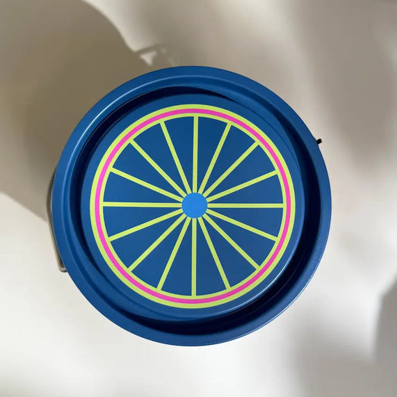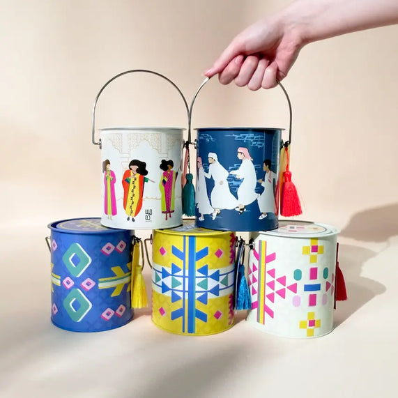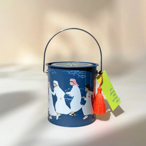 علبة معدنية مرحة مستوحاة من ذكريات الأولاد وهم يلعبون بالتيلا وعجلات السيارات في الأزقة. صممت للاحتفال بحق الليلة بلمسة نوستالجية مرحة، مناسبة لملئها بالحلوى وتقديمها للأطفال والكبار.