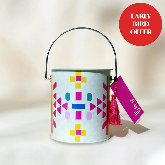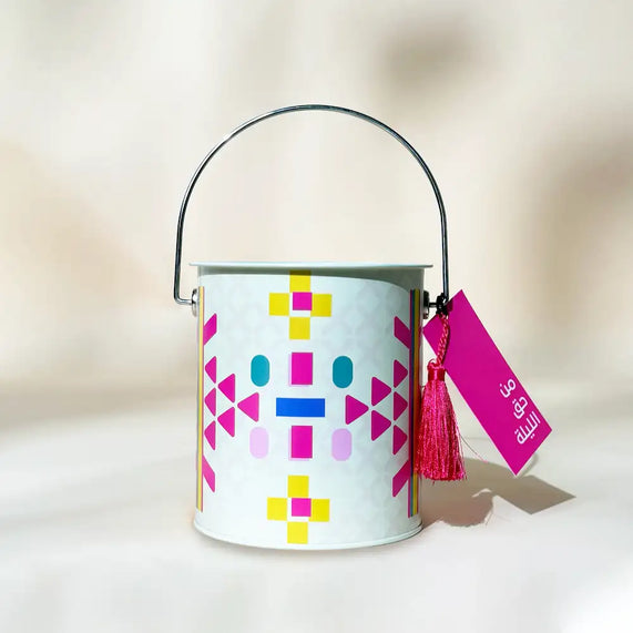 Inspired by the beautiful traditional Sadu weaves, we've designed modern & colorful metal cans to celebrate Hag Ellaila, a traditional Emirati celebration on the night before the mid of Shabaan (the 8th month of the Islamic Hijri calendar) where children visit neighbours chanting folk songs and collecting candy.