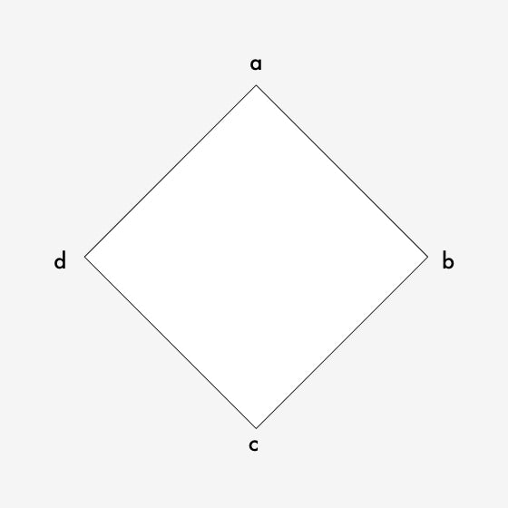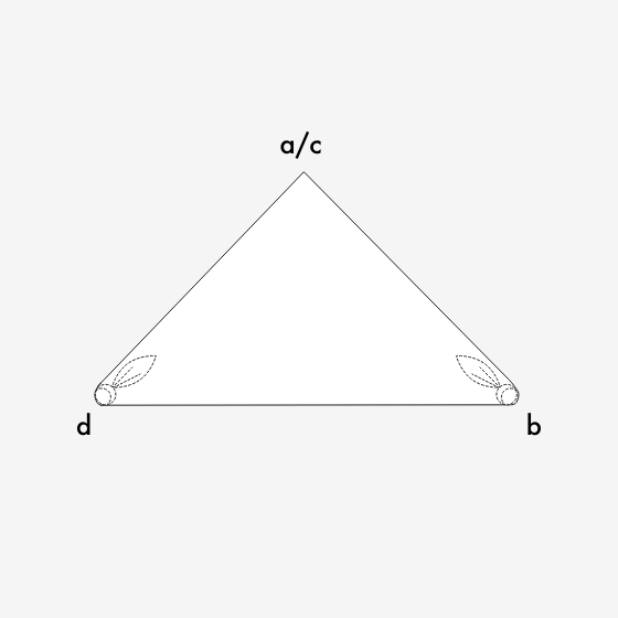 Gather corner “d” and measure approximately 1/2 the length of the side of the triangle. Tie into a single knot. Repeat the same for “b.”