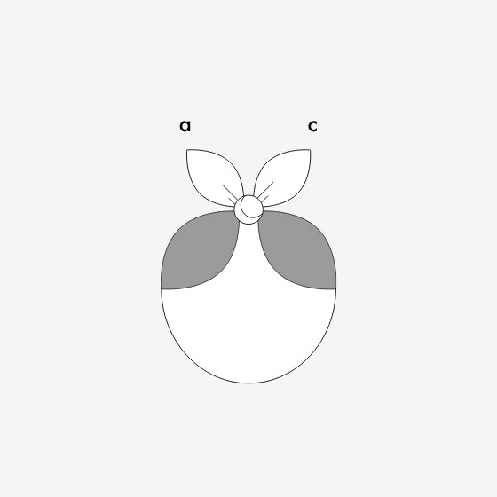 Flip the wrap inside out so that the two knots are sitting inside of the bag. Hold “a” and “c” up.