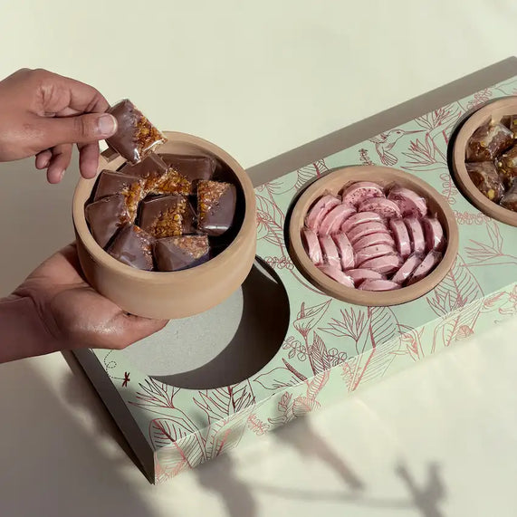 The set includes three clay pots filled with a curated selection of premium sweets by Ananas: