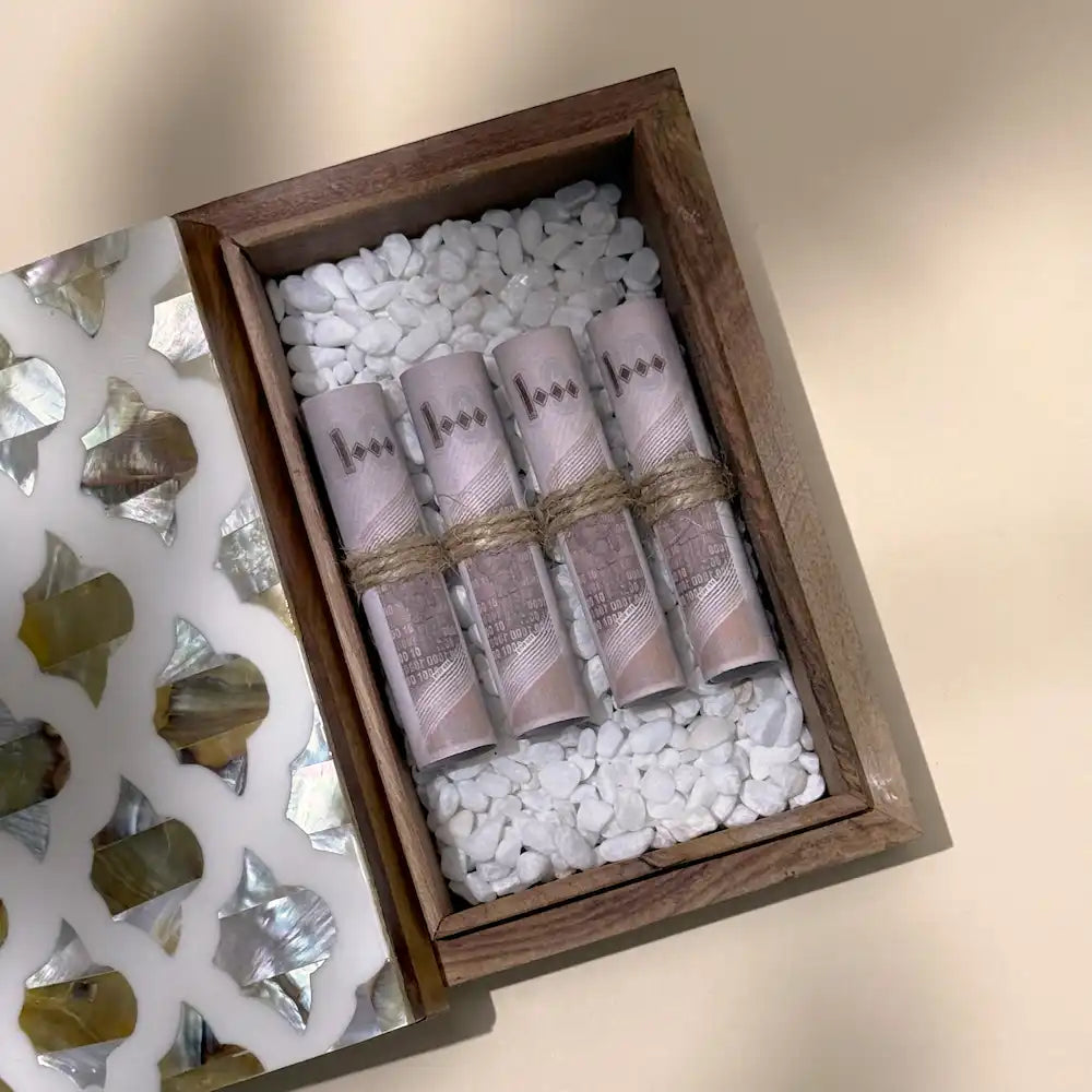 A Wooden Box with a delicate cutout design, perfect for placing cash or small keepsakes.