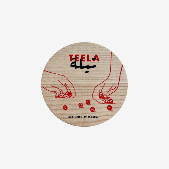 It’s a minimal wooden circular Teela-holder attaches magnetically, with 10 Teela balls in between. The striking red packaging designed beautifully and adorned with illustrations printed in foiling attached to a Pink traditional fabric with candies inside and Hag Ellaila blue tag.